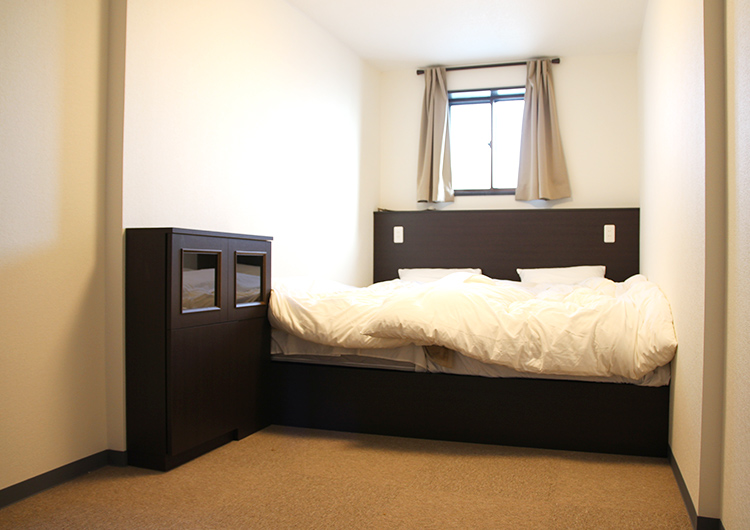 - シングル・ダブルベッドを設置した、お二人での滞在に最適な洋室です。鍵がついていますので、お一人様のご利用でも自分だけの空間が欲しい!という場合には、こちらのシングル・ダブルルームをご利用ください。(お一人様のご利用時はシングルベットルームご案内の場合有)